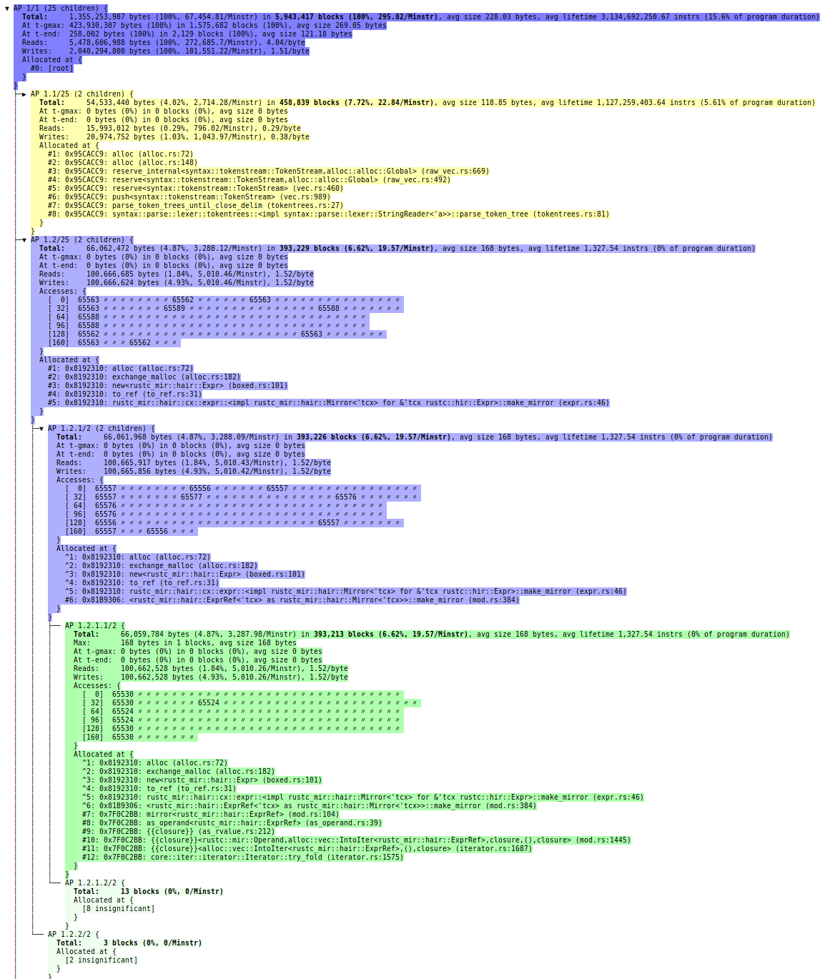 The root node covers the entire execution. The information is a superset of the information shown when DHAT ran, adding details such as allocation rates, average block sizes, block lifetimes, and read and write ratios. The next example will explain these in more detail.